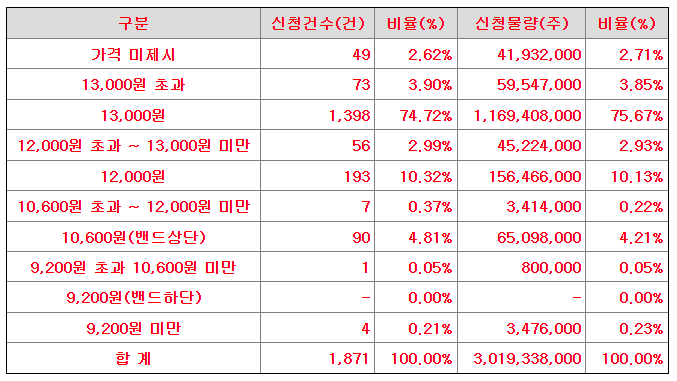 또한 청약 참여 기관 중 전체의 99.72%가 희망공모가 밴드 상단 이상으로 제시했기 때문에 최종적으로 공모가를 기존 상단을 초과한 1만2000원으로 결정했다는 설명입니다.