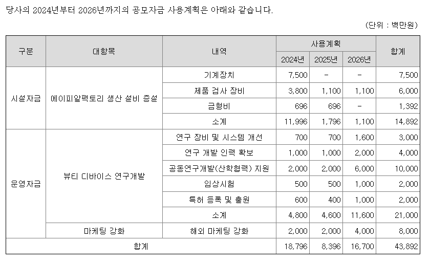 에이피알의 대표주관사는 신한투자증권, 공동주관사는 하나증권으로 공모가는 주당 평가가액 24만6237원에 할인율 40.30~18.78%가 적용된 범위입니다. 할인율은 최근 3년 코스피 시장 일반상장법인의 평균인 38.36~24.15%를 참고했다고 하는데요, 주당 평가가액 24만6237원을 산출하기 위해 적용한 당기순이익은 766억원, 적용 주식 수는 779만6228주, 주가수익비율(PER)은 25.07배입니다. 당기순이익 766억원은 2023년 3분기 당기순이익을 기준으로 연환산(최근 4분기 합계)한 수치인데 참고로 에이피알은 2023년 3분기 연결기준 매출 3718억원, 당기순이익 574억원을 기록했습니다.