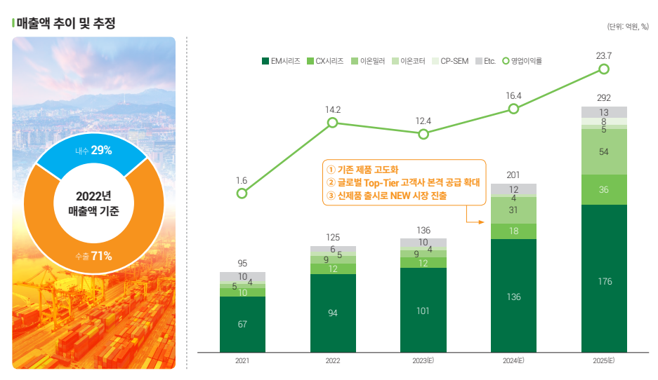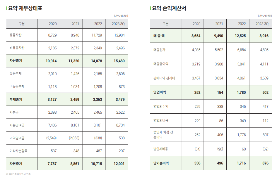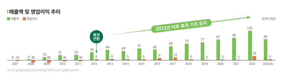 코셈은 기술특례상장 방식으로 코스닥 상장을 추진 중인데요, 2012년부터 매년 흑자를 기록했습니다. 2022년에는 매출 125억원, 영업이익 18억원을 달성했으며 지난해 3분기 누적 실적은 매출 89억원, 영업이익 5억원 등입니다.