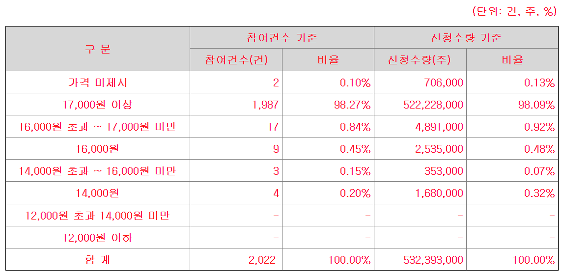 코셈 수요예측에서 신청 수량 99.1%가 확정 공모가를 초과하는 가격을 제시했다고 하는데요, 시장 친화적 공모가로 일반투자자 진입장벽을 낮추려는 발행사 의사를 반영해 공모가를 1만6000원으로 확정했다는 설명입니다.
